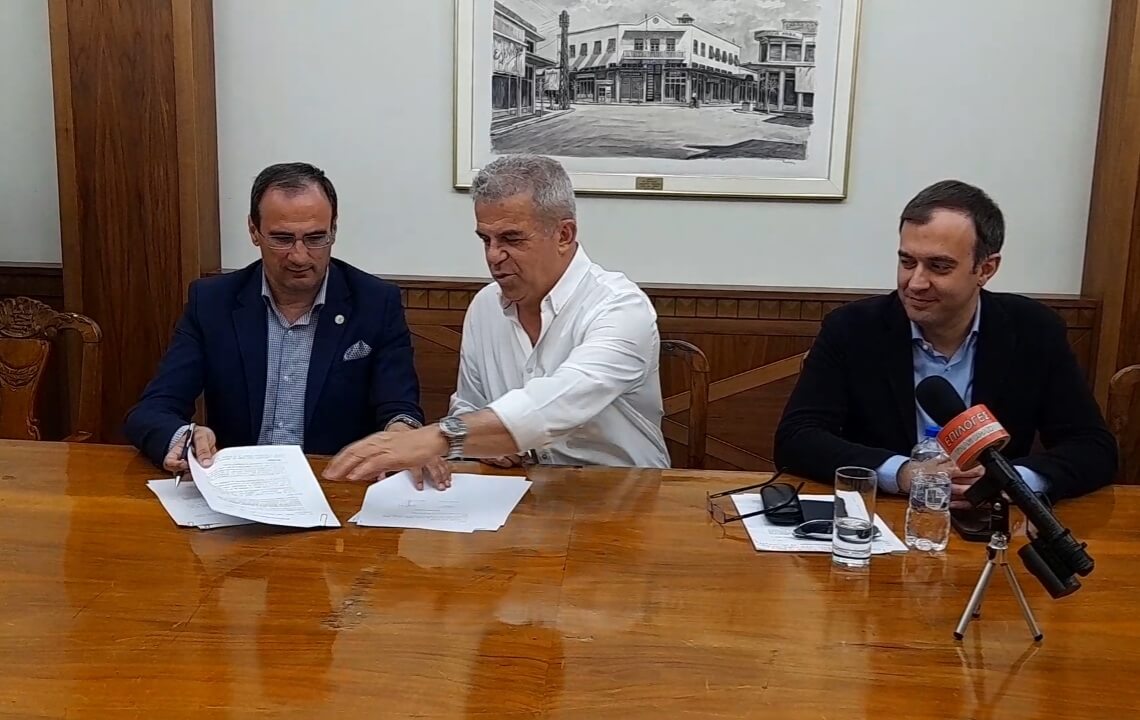 Ο Δήμαρχος Σερρών, Αλέξανδρος Χρυσάφης και ο Πρόεδρος της Ανώτατης Σχολής Παιδαγωγικής και Τεχνολογικής Εκπαίδευσης (ΑΣΠΑΙΤΕ) Γιώργος Χατζαράκης υπογράφουν την προγραμματική σύμβαση για την δημιουργία του Παραρτήματος της ΑΣΠΑΙΤΕ στις Σέρρες, υπό το βλέμμα του βουλευτή Τάσου Χατζηβασιλείου