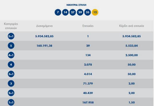 Στην Αθήνα συμπληρώθηκε το δελτίο του Τζόκερ που έκανε έναν υπερτυχερό πλουσιότερο κατά 5,9 εκατομμύρια ευρώ. Συγκεκριμένα το τυχερό δελτίο του Τζόκερ συμπληρώθηκε από τον κάτοχό του στην οδό Αχαρνών με πλήρες σύστημα. Οι 5+1 αριθμοί που μαντεύθηκαν σωστά και έβαλαν στον τραπεζικό του λογαριασμό το αστρονομικό ποσό ήταν οι: 7, 14, 27, 29, 35 και Τζόκερ ο αριθμός 12. Παράλληλα, στη δεύτερη κύρια κατηγορία βρέθηκαν 28 δελτία που κερδίζουν από 5.523 ευρώ. Τα 19 εξ αυτών περιλαμβάνονται στο σύστημα που συμπλήρωσε ο μεγάλος τυχερός. Τα εναπομείναντα 9 δελτία συμπληρώθηκαν σε πρακτορεία στην Κηφισιά, το Χαλάνδρι, το Αιγάλεω, τη Λάρισα, τα Ιωάννινα, τη Ρόδο, τον Κορυδαλλό και την Πρέβεζα.