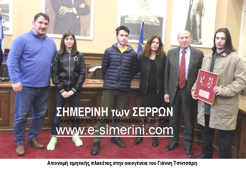 Από τον κ. Μωυσιάδη έγινε ειδική μνεία στον αείμνηστο Σερραίο Ολυμπιονίκη Γιάννη Τσιντσάρη που ανέδειξε τις Σέρρες με τις επιτυχίες του. Ο αντιπεριφερειάρχης Σερρών απένειμε στην οικογένεια του αείμνηστου Σερραίου Ολυμπιονίκη ,Γιάννη Τσιντσάρη, τιμητική πλακέτα ως ένδειξη αναγνώρισης της προσφοράς του και τιμής στην μνήμη του. Η σύζυγος του και τα παιδιά του Γιάννη Τσιντσάρη που έφυγε νωρίς από την ζω, παρέλαβαν συγκινημένοι την τιμητική πλακέτα.