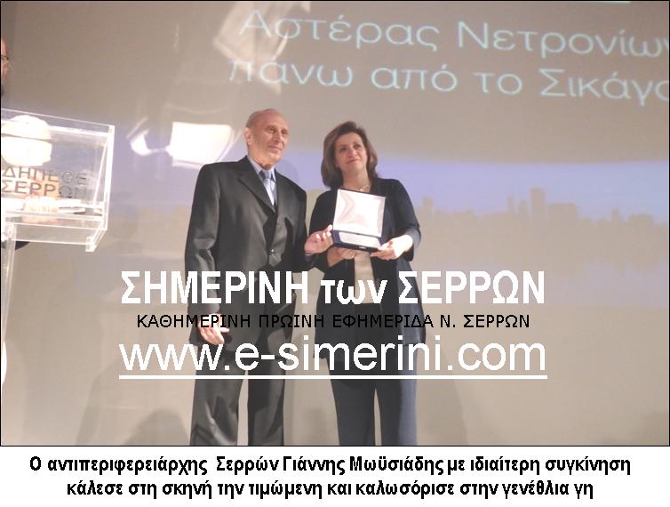 Ο αντιπεριφερειάρχης Σερρών Γιάννης Μωϋσιάδης με ιδιαίτερη συγκίνηση κάλεσε στη σκηνή την τιμώμενη και μιλώντας από καρδιάς καλωσόρισε στην γενέθλια γη τη σερραία επιστήμονα. Εξέφρασε τη βαθιά του ευγνωμοσύνη για τα σπουδαία επιστημονικά της επιτεύγματα, που μας κάνουν περήφανους ως Έλληνες αλλά και ως Σερραίους. Όπως τόνισε ο κ. Μωυσιάδης, η Βίκυ Καλογερά αποτελεί φωτεινό παράδειγμα για όλους και κυρίως για την νεολαία, καθώς έχει καταφέρει να διαπρέψει στο εξωτερικό και να συμβάλει τα μέγιστα στην πρόοδο της αστροφυσικής. Ως μια ελάχιστη ένδειξη τιμής ο Αντιπεριφερειάρχης χάρισε στην κ. Καλογερά μια αναμνηστική πλακέτα , τρία βιβλία που αφορούν στις Σέρρες, καθώς και ένα ακριβές αντίγραφο κεφαλής Κόρης που βρέθηκε σε ανασκαφή στην περιοχή της Αμφίπολης. «Τιμάς την πόλη μας κάνεςι περήφανους εμάς και παραδειγματίζεις την νεολαία μας, δήλωσε ο κ. Μωυσιάδης και ζήτησε να την αγκαλιάσει ως ένδειξη πατρικής στοργής.