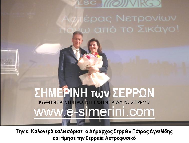 Την κ. Καλογερά καλωσόρισε επίσης ο Δήμαρχος Σερρών Πέτρος Αγγελίδης και τίμησε την Σερραία Αστροφυσικό. «Επιτρέψτε μου εκ μέρους του δημοτικού συμβουλίου Σερρών να σας εκφράσω τον θαυμασμό μας για την πλούσια επιστημονική σταδιοδρομίας σας. Τα σημειολογικά δώρα που θα σας επιδώσω αποτελούν την ελάχιστη έκφραση τιμής στο πρόσωπο σας εκ μέρους των συμπολιτών μας για τις διακεκριμένες διεθνώς επιστημονικές υπηρεσίες σας. Θερμά συγχαρητήρια και σας εύχομαι ακολουθώντας τα βήματα και τις σκέψεις του μεγάλου στοχαστή Αϊνστάιν να κατακτήσετε το διάστημα και να λύσετε όλα μυστήρια που μας περιβάλλουν. Σας ευχαριστώ που μας κάνετε περήφανους ως Σερραίους»,δήλωσε ο κ. Αγγελίδης. .
