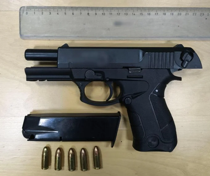● ένα πιστόλι, γεμιστήρας και 5 φυσίγγια των 9 χιλιοστών,