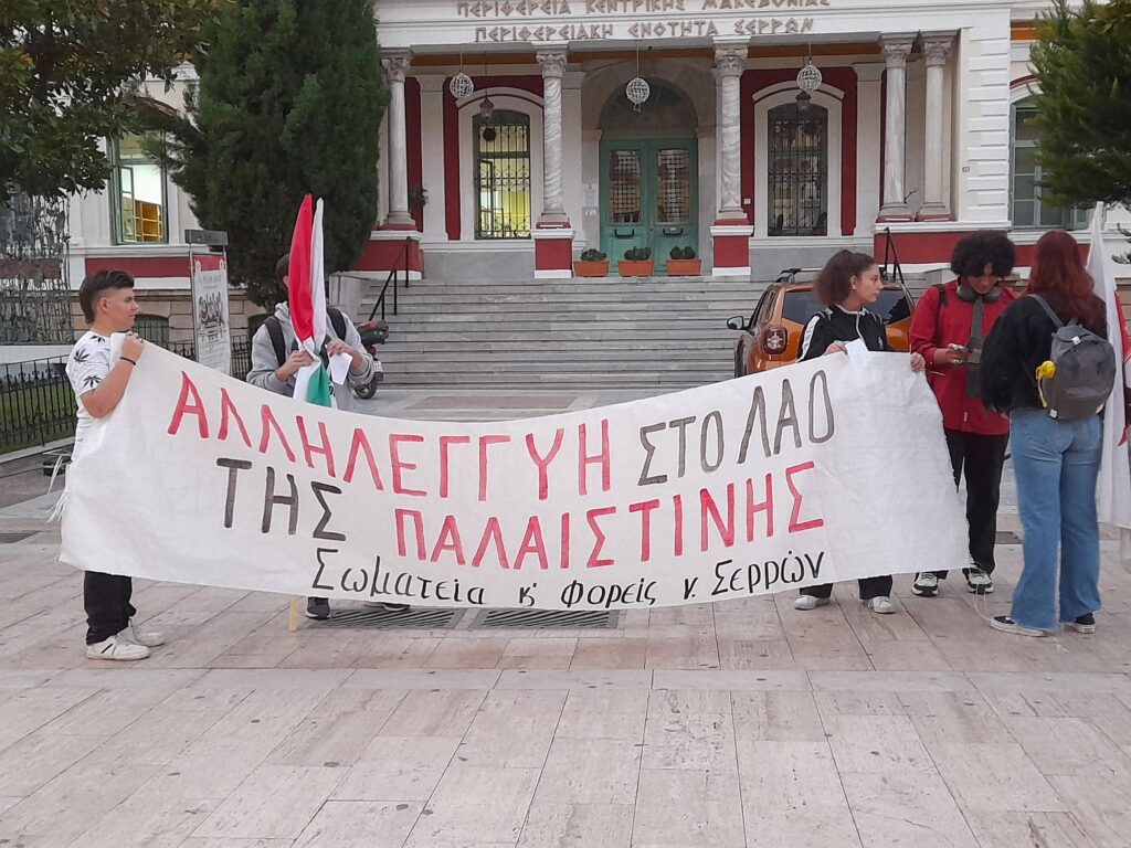 Συγκέντρωση αλληλεγγύης προς τον Παλαιστινιακό λαό πραγματοποιήθηκε το απόγευμα της Παρασκευής 20 Οκτωβρίου 2023, μπροστά στο Διοικητήριο Σερρών, επί του πεζόδρομου Κωνσταντίνου Καραμανλή.