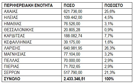 Συγκεκριμένα, με την 5η κατανομή καταβλήθηκαν 2.433.346,51 €, ενισχύοντας σημαντικά τις Περιφερειακές Ενότητες Λάρισας (26,3%), Αχαΐας (25,6%) και Σερρών (21,3%).