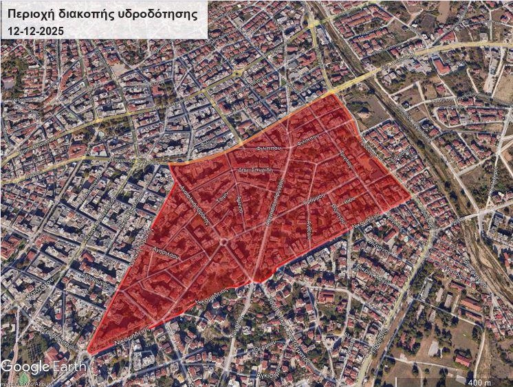 Λόγω βλάβης στο πρωτεύον δίκτυο ύδρευσης στην οδό Νικομηδείας, σήμερα Παρασκευή 12-12-2025 και στις ώρες από 09:00’ έως 14:00’, θα σημειωθεί διακοπή υδροδότησης στην περιοχή που περικλείεται από τις οδούς: Νικομηδείας, Προύσσης, Μεγ. Αλεξάνδρου και Δυτ. Θράκης. Η υδροδότηση θ’ αποκατασταθεί σταδιακά μετά το πέρας των εργασιών.