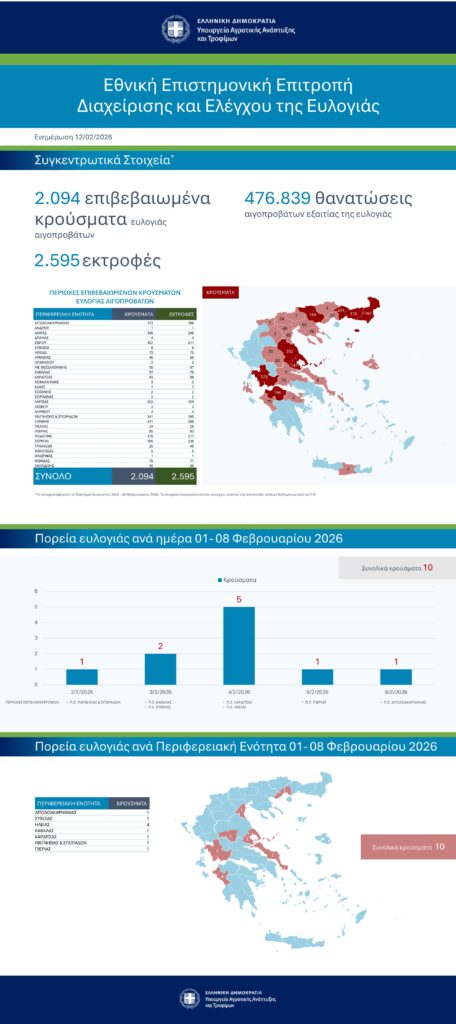Το Υπουργείο Αγροτικής Ανάπτυξης και Τροφίμων και η Εθνική Επιστημονική Επιτροπή Διαχείρισης και Ελέγχου της Ευλογιάς των αιγοπροβάτων ενημερώνουν ότι η συνολική εικόνα της νόσου για το διάστημα από τον Αύγουστο 2024 έως και 08 Φεβρουαρίου 2026 διαμορφώνεται ως εξής: