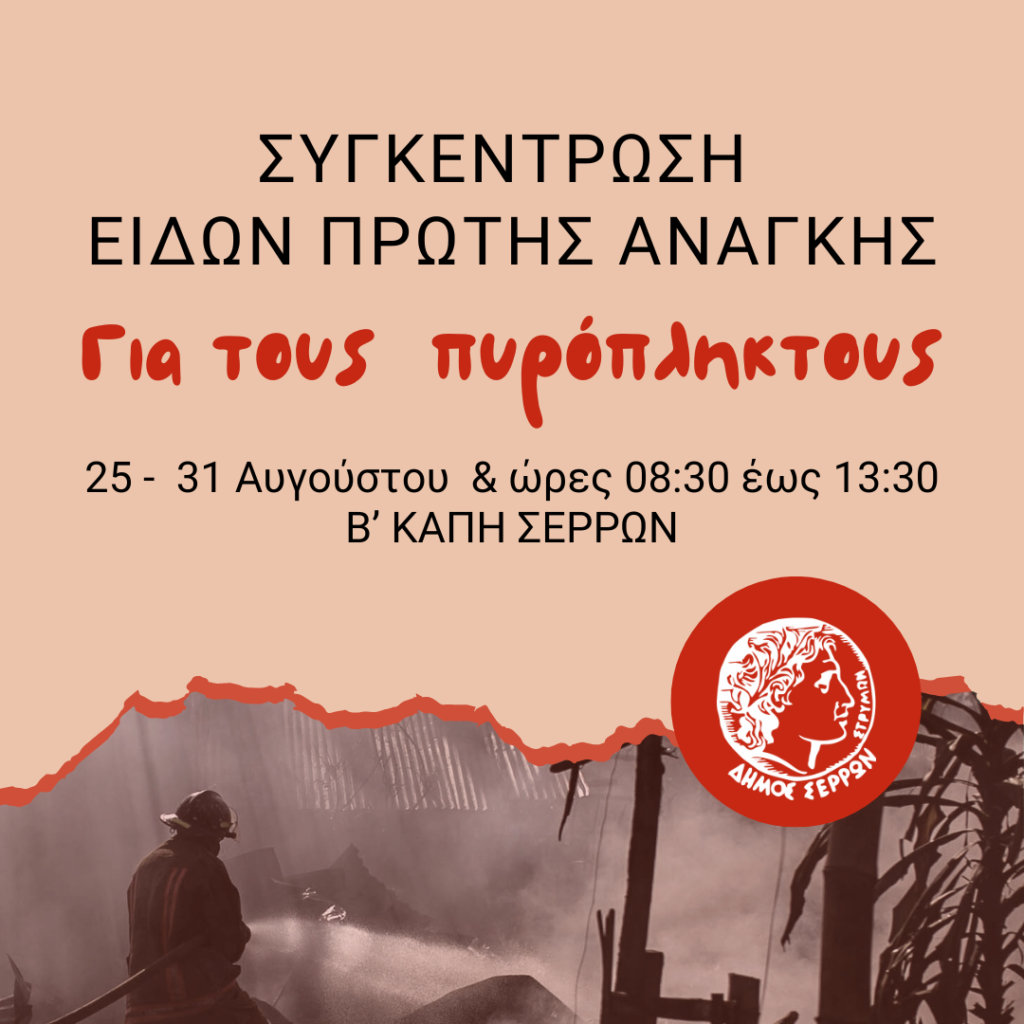 Κάλεσμα στους Σερραίους να ανταποκριθούν και να συνδράμουν στη συγκέντρωση ειδών πρώτης ανάγκης που προχωρά ο Δήμος Σερρών προκειμένου να συνδράμει τους κατοίκους των πυρόπληκτων περιοχών της Περιφερειακής Ενότητας Έβρου.