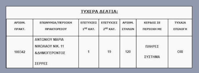 Εκτός από την μοναδική επιτυχία στην πρώτη κατηγορία (6αρια) του Τζόκερ που θα του προσθέσει 3.484.785,36 ευρώ στον λογαριασμό του, ο μεγάλος τυχερός πρόσθεσε και 19 επιτυχίες στη δεύτερη κατηγορία (5αρια).