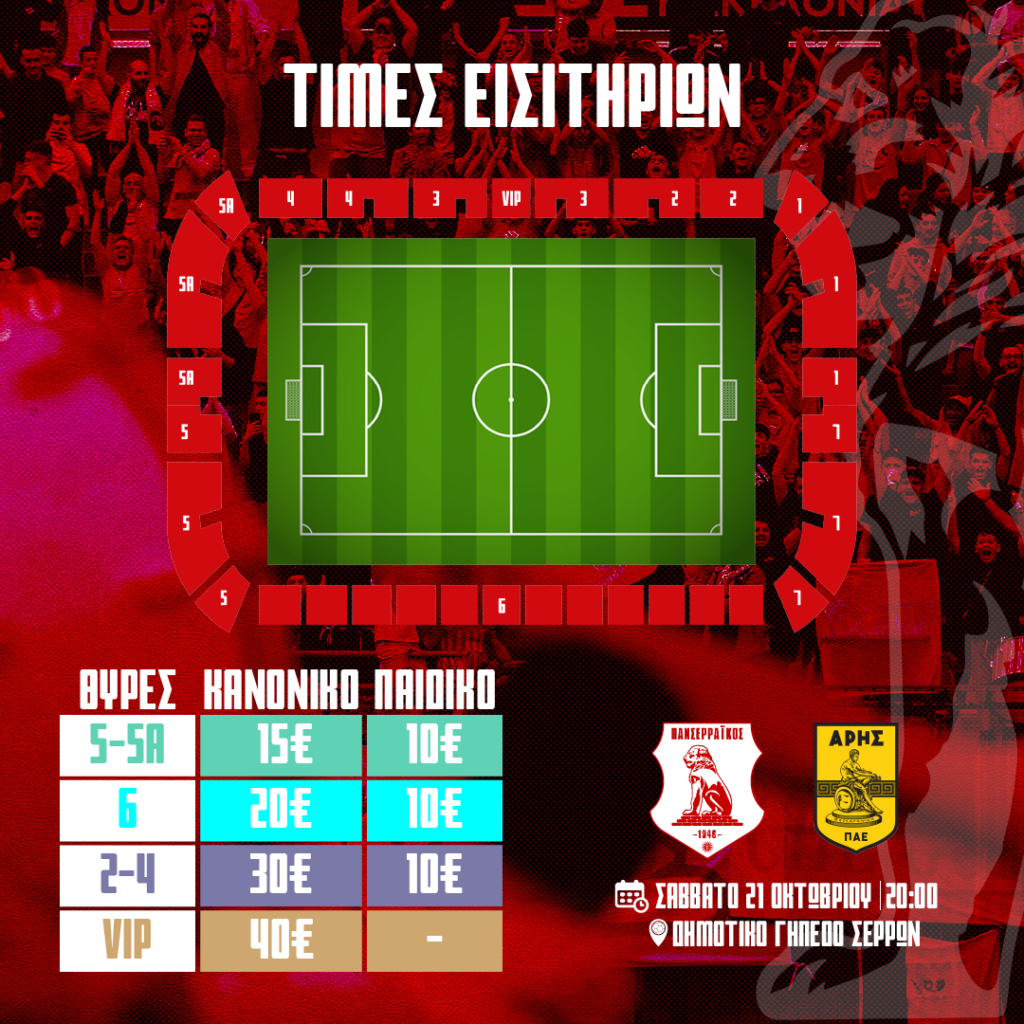 *Θύρες 5-5Α: 15€ – Παιδικό: 10€ (γεννηθέντες 2008 έως 2012 με επίδειξη πιστοποιητικού)