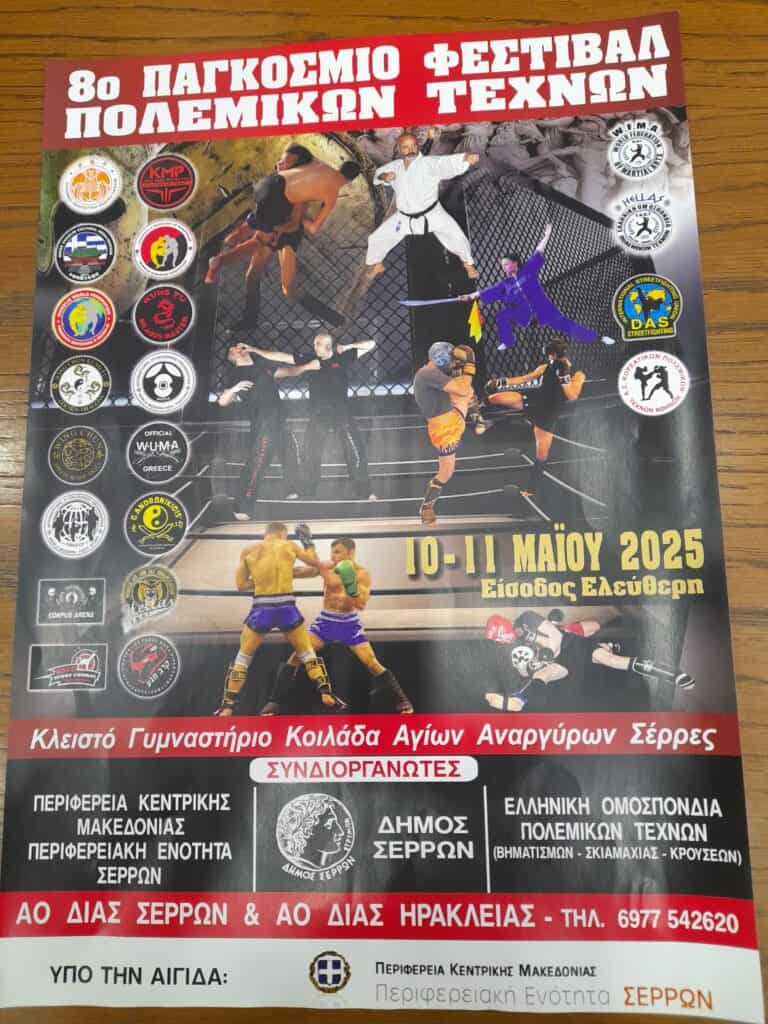 Το Παγκόσμιο Φεστιβάλ Πολεμικών Τεχνών που αποτελεί θεσμό πλέον για τον Δήμο Σερρών, θα διεξαχθεί το διήμερο 10 και 11 Μαΐου 2025, στο Κλειστό Γυμναστήριο της Κοιλάδας Αγίων Αναργύρων των Σερρών.