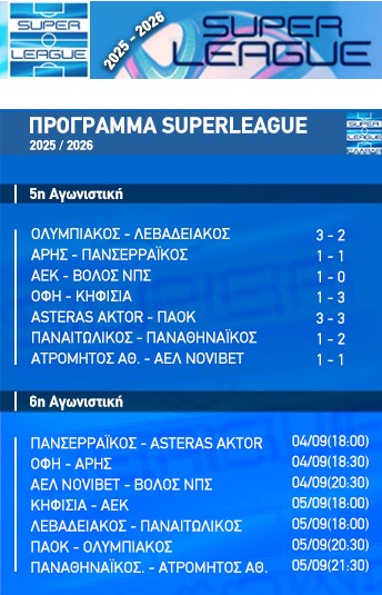 Ολυμπιακός και ΑΕΚ ισοβαθμούν στην πρώτη θέση του βαθμολογικού πίνακα της Stoiximan Super League, μετά την πρώτη νίκη του Παναθηναϊκού στο πρωτάθλημα. Ο Ολυμπιακός επικράτησε του Λεβαδειακού με 3-2 το Σάββατο 27/9 και η ΑΕΚ του Βόλου με 1-0 το απόγευμα της Κυριακής, με τις δύο ομάδες να βγαίνουν οι κερδισμένες της 5ης αγωνιστικής. Οι Άρης και ΠΑΟΚ έφεραν ισοπαλία με τους Πανσερραϊκό και Αστέρα AKTOR αντίστοιχα, ενώ ο Παναθηναϊκός με το 2-1 κόντρα στον Παναιτωλικό, πήρε την πρώτη του νίκη στο πρωτάθλημα.