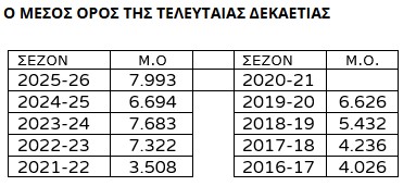 Ο καλύτερος μέσος όρος εισιτηρίων της τελευταίας δεκαετίας είναι στα 7.683 εισιτήρια του 2023-24, ενώ η πιο μικρή προσέλευση ήταν το 2021-22, λίγο μετά τον Covid-19 και τους περιορισμούς που υπήρχαν.
